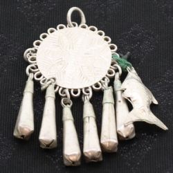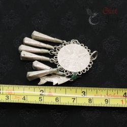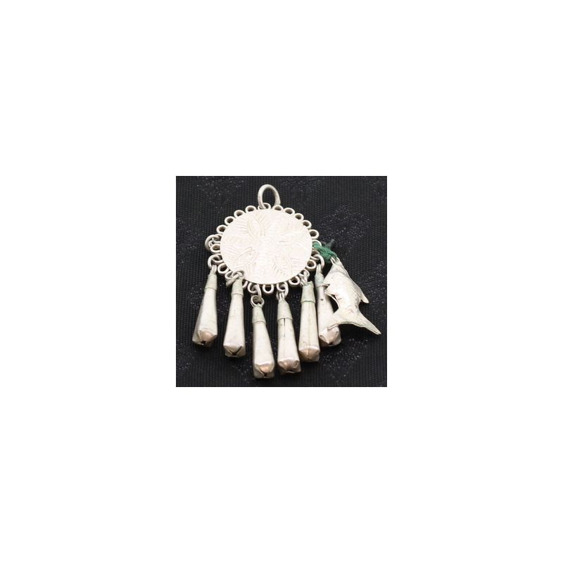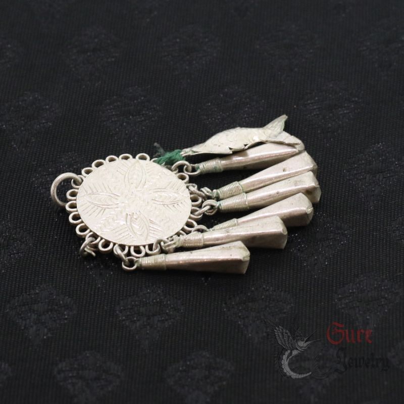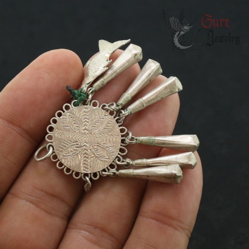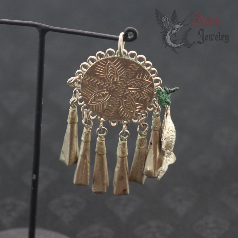 YA0 (MUSER) TRIBAL EARRING OR NECKLACE PENDANT, HAND-FORGED FROM A SILVER ALLOY (UNTESTED) BY A TRIBAL SILVERSMITH AT THE THAILAND–MYANMAR BORDER. ORIGINAL ETHNOGRAPHIC PIECE WITH GEOMETRIC ENGRAVINGS AND MULTIPLE DROPLETS, REPRESENTING CLASSIC YA0 METALWORK. POSSIBLE AGE: EARLY–MID 20TH CENTURY.