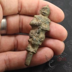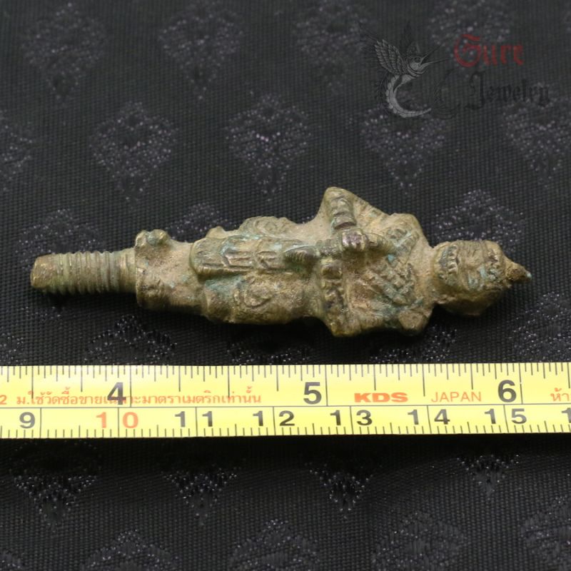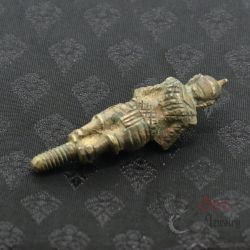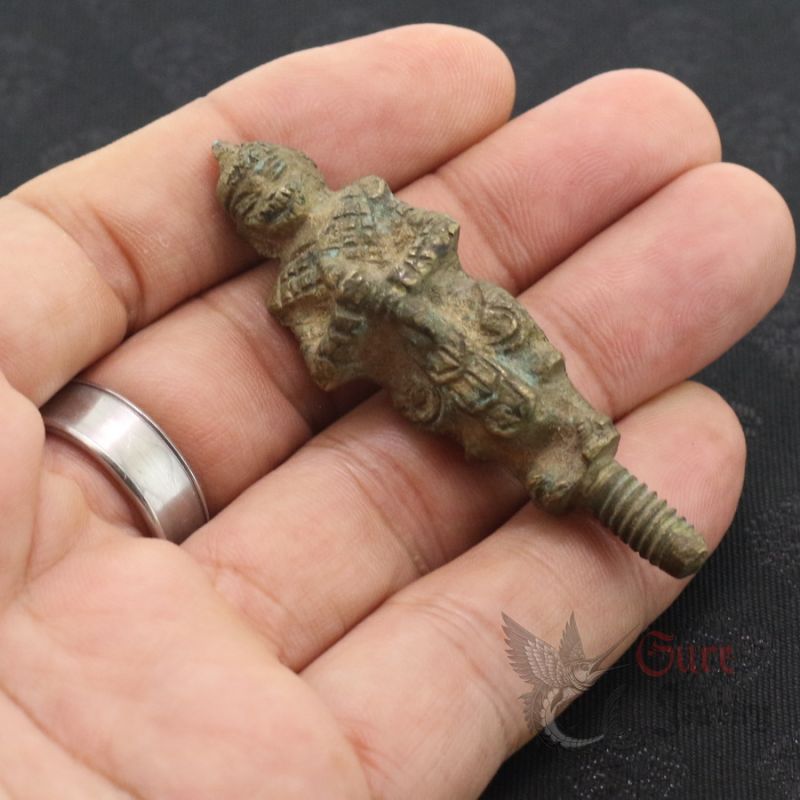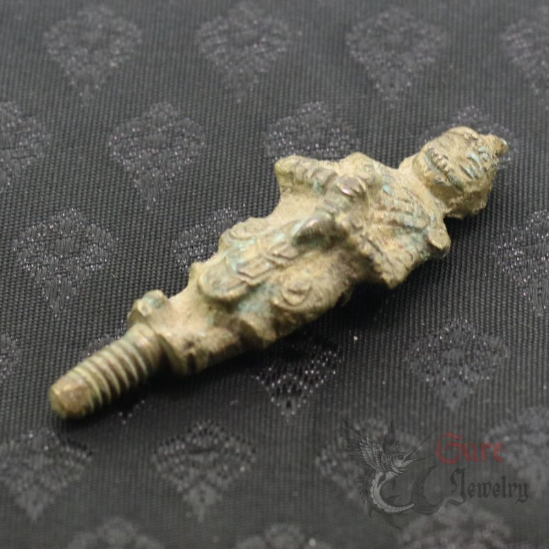 HAND-CASTED BRONZE HANUMAN FIGURE, REPRESENTING THE MONKEY GOD KNOWN FOR STRENGTH, PROTECTION, AND COURAGE. THIS PIECE IS THE TOP SECTION OF A TRADITIONAL THREE-PART TATTOO TAPPER TOOL, USED IN ANCIENT BURMESE AND THAI BODY ART PRACTICES. MADE IN THE MID-20TH CENTURY PERIOD, SHOWING STRONG AGE CHARACTERISTICS AND ORIGINAL PATINA.