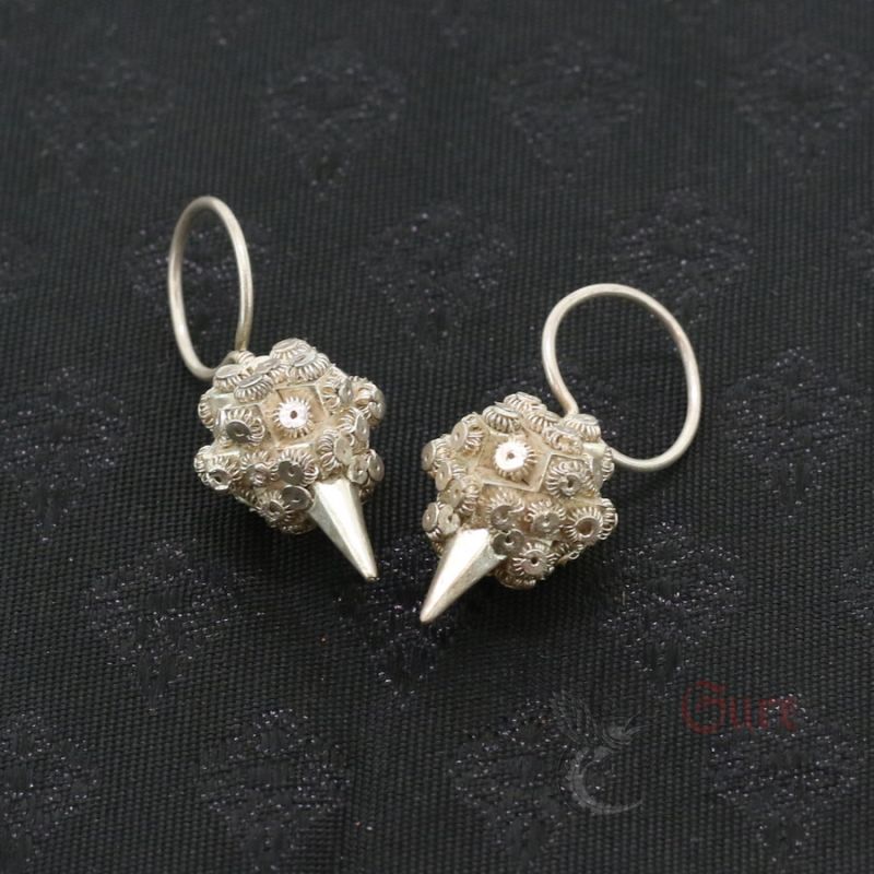A FINE PAIR OF SILVER YAO “SEED BAG” EARRINGS, ALSO KNOWN AS “SEED POUCH” OR “SEED POD” EARRINGS — A DISTINCTIVE STYLE TRADITIONALLY WORN BY YAO (MIEN) HILL TRIBE WOMEN ACROSS NORTHERN THAILAND, LAOS, AND SOUTHERN CHINA. HANDCRAFTED IN SILVER (NOT TESTED), EACH EARRING FEATURES THE CHARACTERISTIC HOLLOW POD-SHAPED TERMINALS THAT SYMBOLIZE FERTILITY AND ABUNDANCE WITHIN YAO CULTURE.
