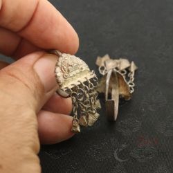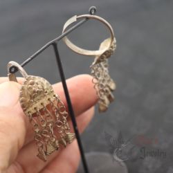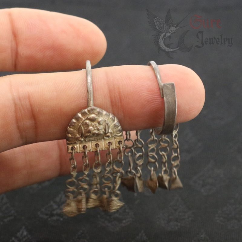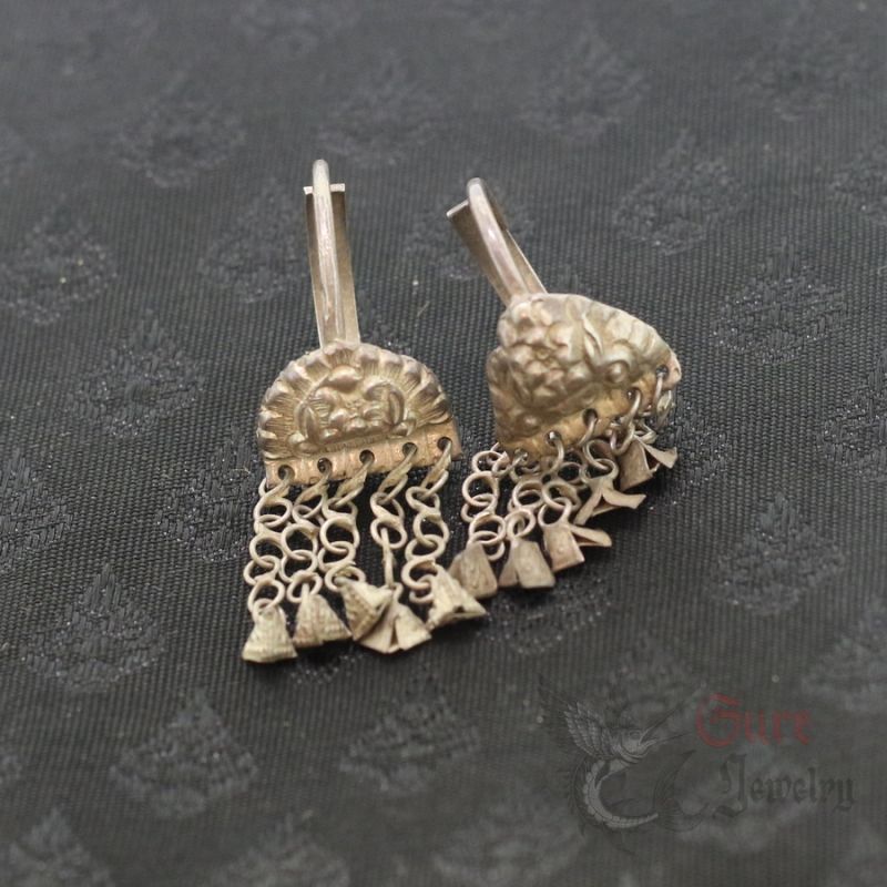 THIS AUTHENTIC PAIR OF ANTIQUE YAO HILL TRIBE EARRINGS ORIGINATES FROM THE GOLDEN TRIANGLE REGION, SPANNING NORTHERN THAILAND, LAOS, BURMA (MYANMAR), AND SOUTHERN CHINA. HANDCRAFTED DURING THE EARLY TO MID-20TH CENTURY, THESE EARRINGS FEATURE A DISTINCT EMBOSSED LION OR DRAGON HEAD MOTIF, SYMBOLIZING PROTECTION, STRENGTH, AND GOOD FORTUNE IN YAO TRIBAL ART. BELOW THE CENTRAL DESIGN HANG DELICATE MULTIPLE SILVER DANGLES, CREATING SUBTLE MOVEMENT AND SOUND WHEN WORN.