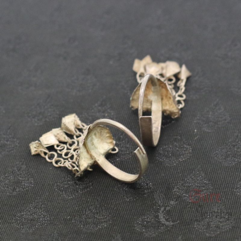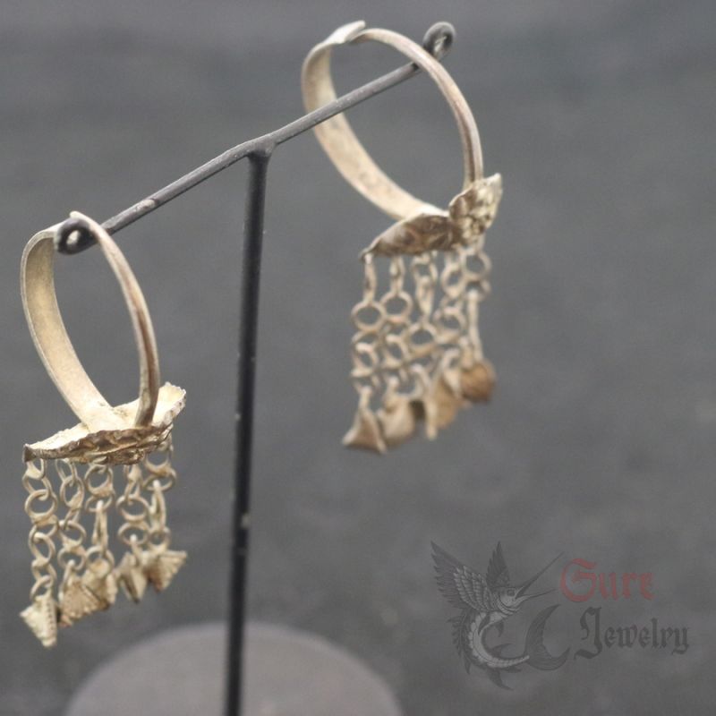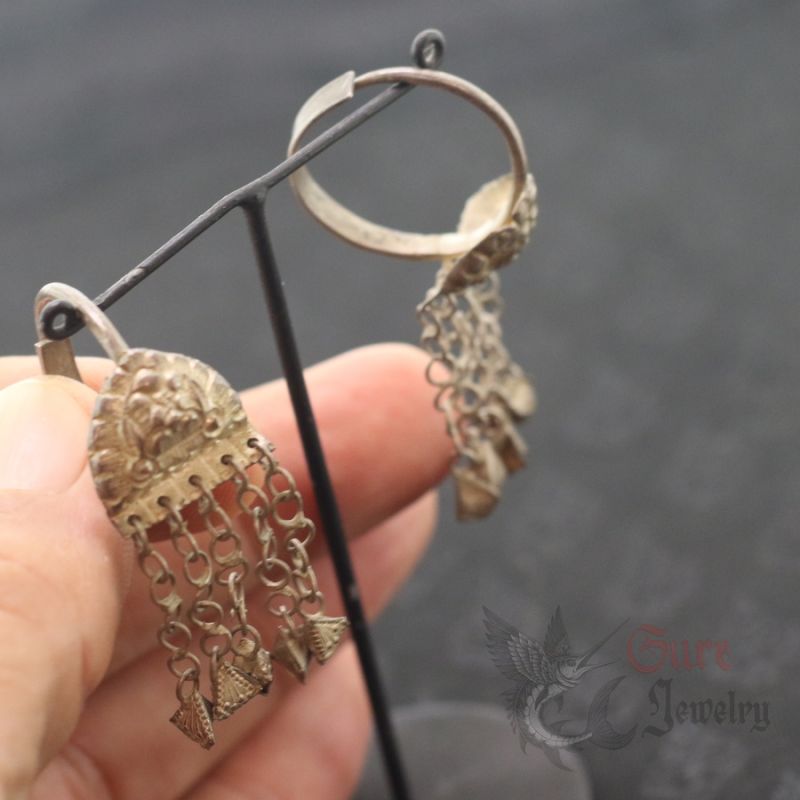 EACH EARRING WEIGHS 7.81 GRAMS, MEASURING 50MM IN LENGTH AND 30MM IN WIDTH, WITH A 1MM EARLOBE HOLE THAT CAN ALSO BE WORN THROUGH AN EAR-TUNNEL. MADE FROM HIGH-SILVER-CONTENT TRIBAL ALLOY (NOT TESTED), THEY REMAIN FULLY INTACT, WEARABLE, AND HIGHLY COLLECTIBLE, SHOWCASING TRADITIONAL HAND-FORMED REPOUSSÉ AND CHAIN-LINK CRAFTSMANSHIP.
