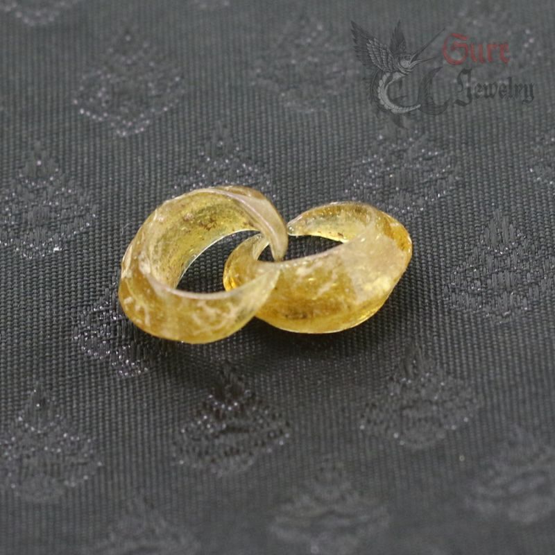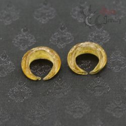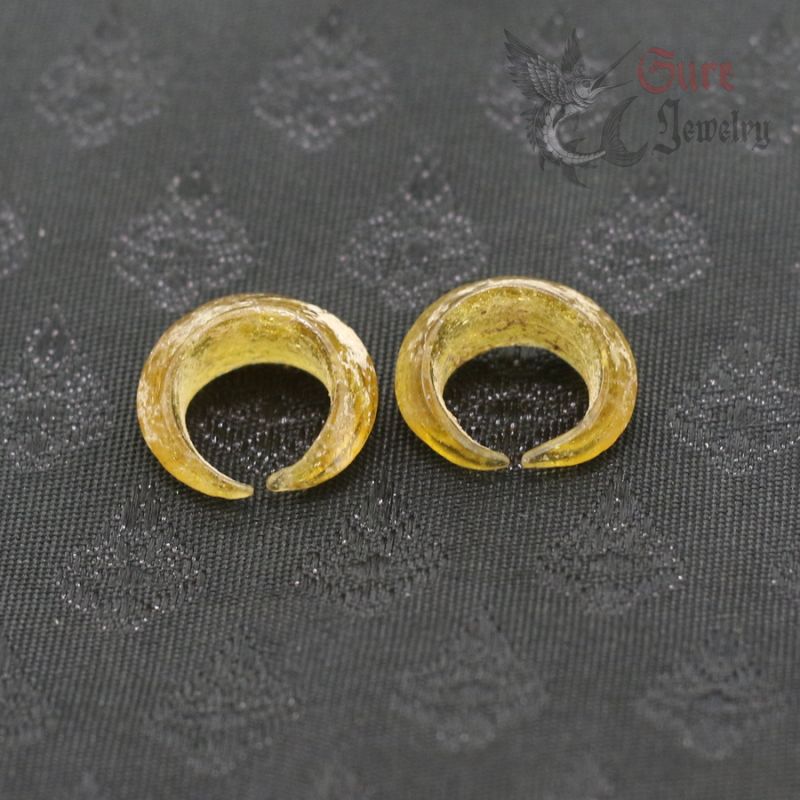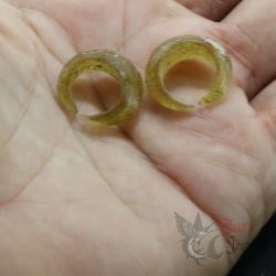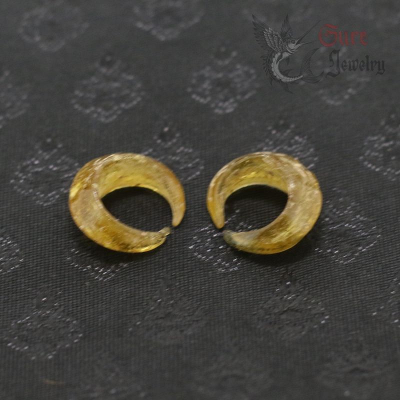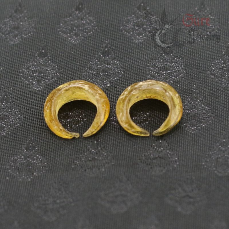 THIS RARE PAIR OF ANTIQUE GLASS EAR PLUGS ORIGINATES FROM ANCIENT CAMBODIA, LIKELY DATING BETWEEN 700 TO 1400 YEARS OLD. BOUGHT FROM PERSONAL COLLECTION, THESE BEAUTIFUL CRESCENT-FORMED ORNAMENTS DISPLAY A DISTINCT WHISKEY-GOLD COLOR AND NATURAL AGE PATINA, CHARACTERISTIC OF EARLY SOUTHEAST ASIAN GLASSCRAFT.