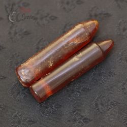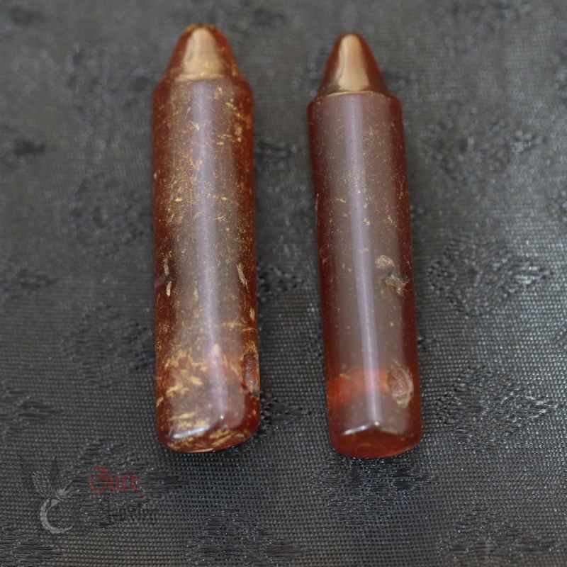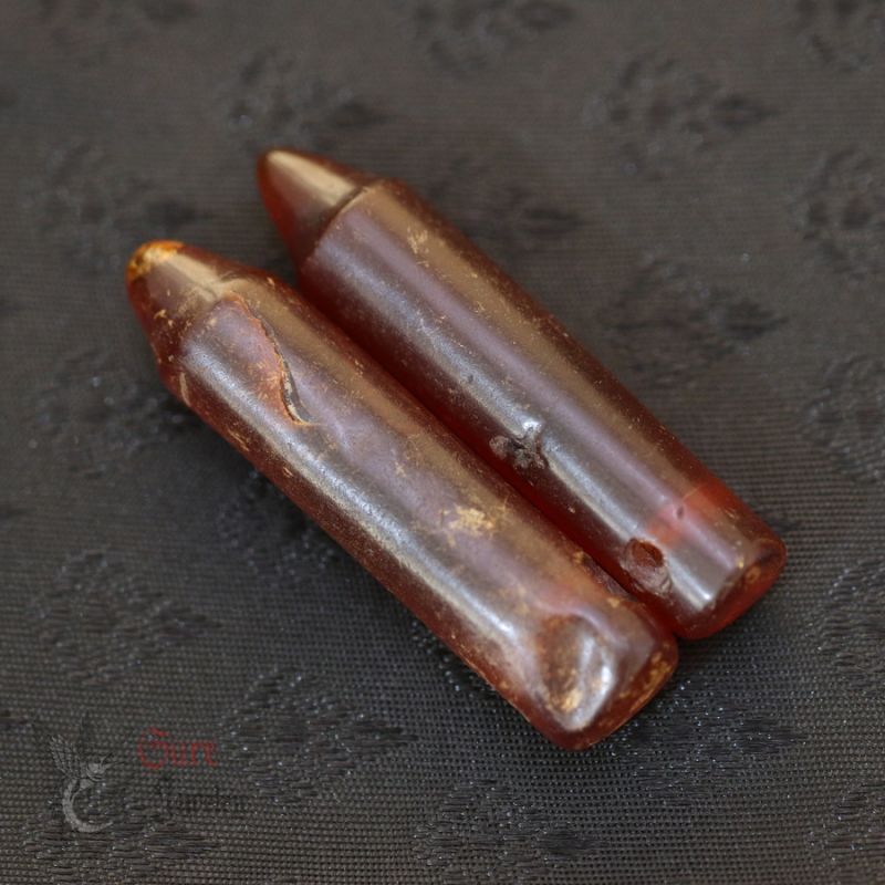 THESE EXAMPLES ARE NOTABLE FOR THEIR UNUSUAL SMALL FORMAT, MEASURING APPROXIMATELY 60 MM IN LENGTH, CONSIDERABLY SHORTER THAN THE MORE COMMON OVERSIZED PATLOKAS, MAKING THEM SCARCE AND HIGHLY DESIRABLE TO COLLECTORS. THE MATERIAL APPEARS TO BE AMBER, MOST LIKELY BURMESE AMBER (BURMITE), DISPLAYING A DEEP, RICH COLOR WITH NATURAL INCLUSIONS AND SURFACE WEAR CONSISTENT WITH AGE AND PROLONGED USE. MATERIAL HAS NOT BEEN SCIENTIFICALLY TESTED, ONLY LIGHTER TESTED.
