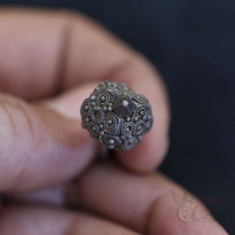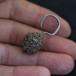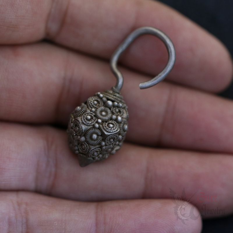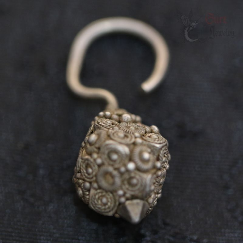 HANDCRAFTED IN SILVER OR HIGH-SILVER ALLOY (NOT TESTED YET), THE EARRING FEATURES A LARGE, ROBUST HOOK INTENDED FOR STRETCHED EARLOBES, COMBINING BOTH FUNCTIONALITY AND STRIKING SCULPTURAL PRESENCE. THE GRANULATED SURFACE AND SOLID CONSTRUCTION INDICATE TRADITIONAL METALWORK TECHNIQUES RATHER THAN MODERN CASTING, SUGGESTING PRODUCTION IN THE LATE 19TH TO EARLY 20TH CENTURY.