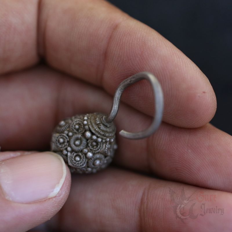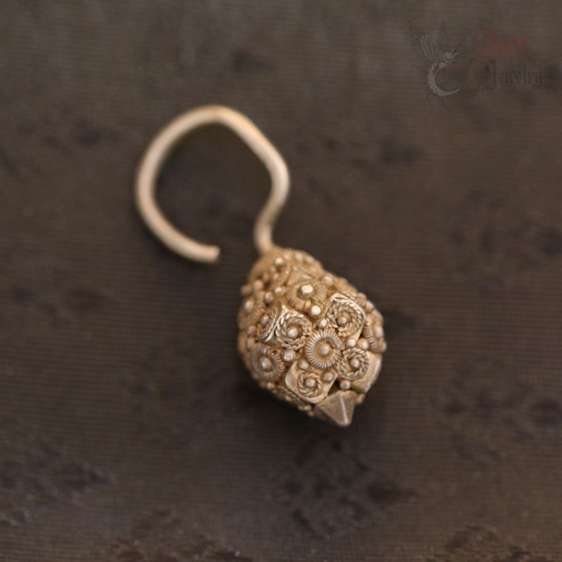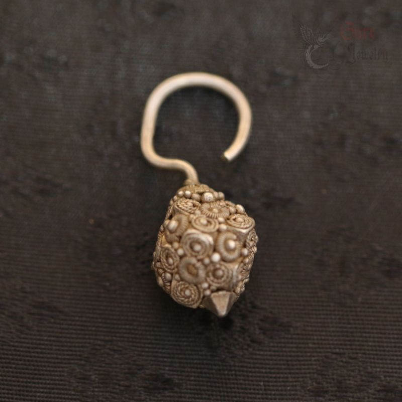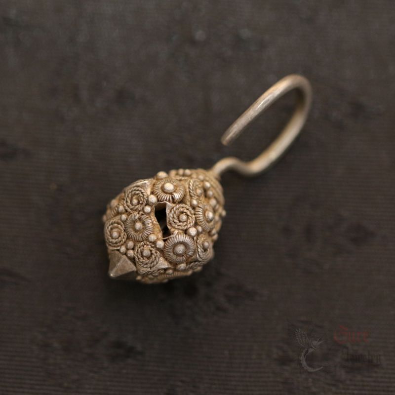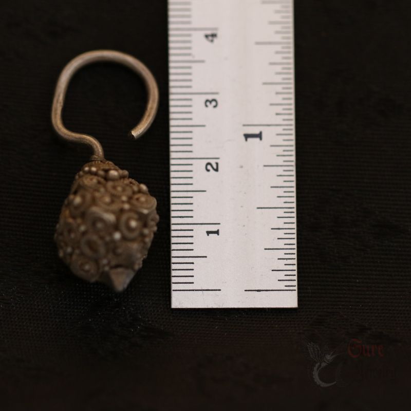 A FINE ANTIQUE SILVER “SEED BAG” HOOK EARRING, BY THE PADAUNG (KAYAN) HILL TRIBE OF BURMA / MYANMAR. THIS DISTINCTIVE FORM, ALSO KNOWN IN ETHNOGRAPHIC LITERATURE AS A “SEED POD” OR “SEED POUCH” EARRING, IS CHARACTERIZED BY ITS HOLLOW, POD-SHAPED TERMINAL DECORATED WITH DENSE GRANULATION AND COILED WIRE MOTIFS. SUCH DESIGNS ARE SYMBOLIC OF FERTILITY, PROSPERITY, AND CONTINUITY, AND ARE STRONGLY ASSOCIATED WITH TRADITIONAL FEMALE ADORNMENT AMONG PADAUNG COMMUNITIES.