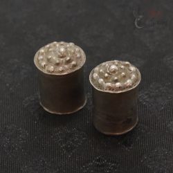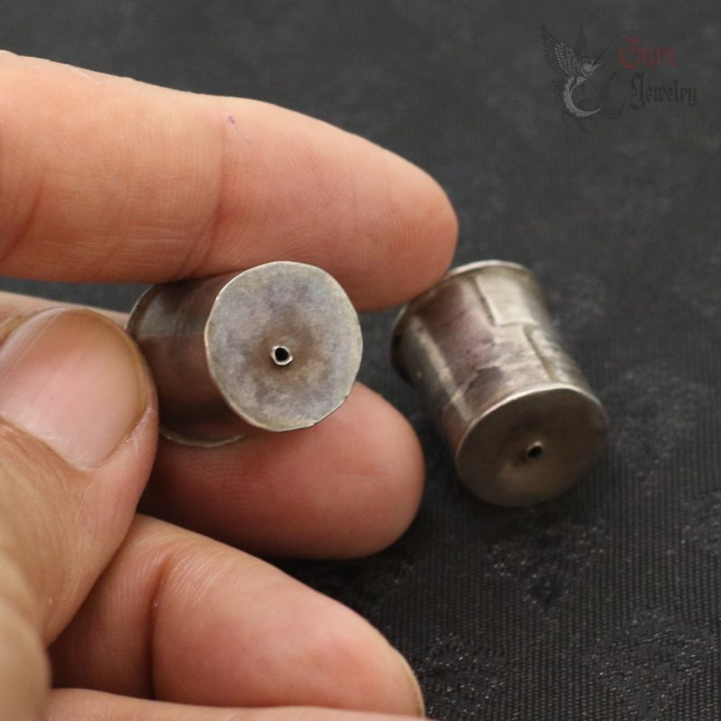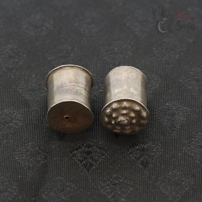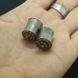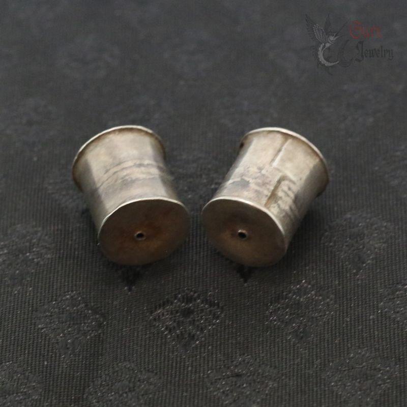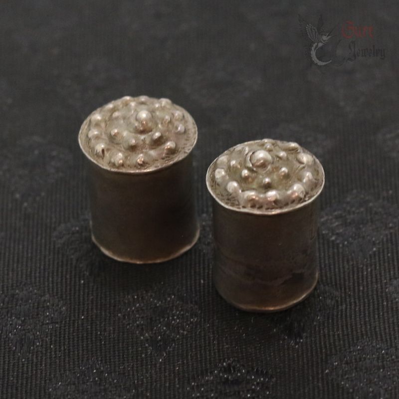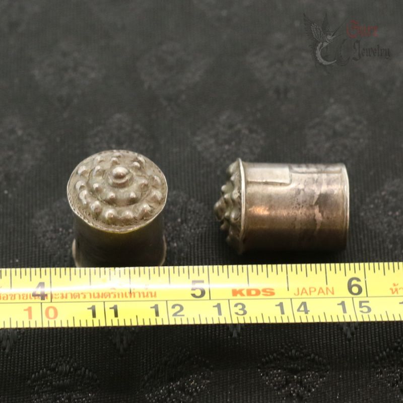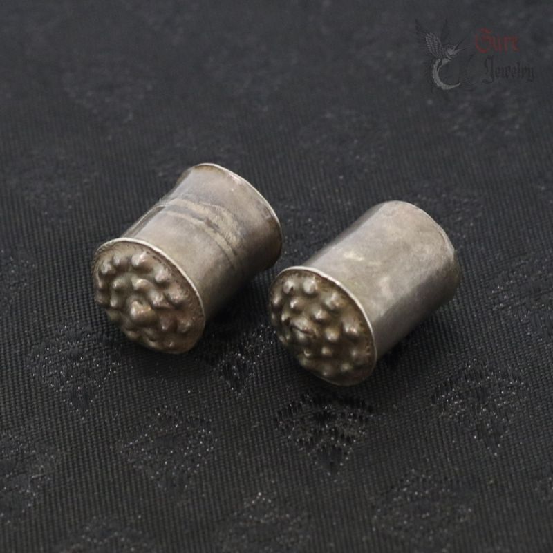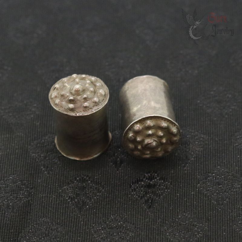 The plugs are made in hollow, sealed construction and are filled with a traditional compound, most likely resin, pitch, or lacquer. The cylindrical, chedi (stupa)-inspired form is characteristic of reliquary-influenced jewelry from this region. In some traditions, objects of this type could also serve as symbolic or actual containers for sacred or ritual contents (such as blessed substances or small relics); without non-invasive examination (e.g., X-ray), the exact nature of the contents cannot be determined.