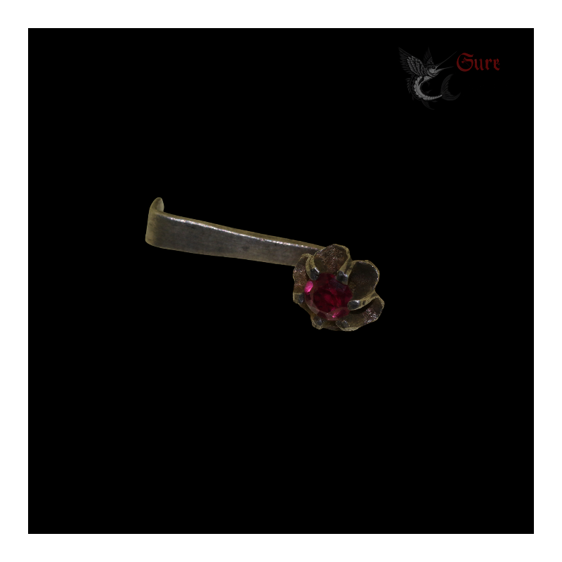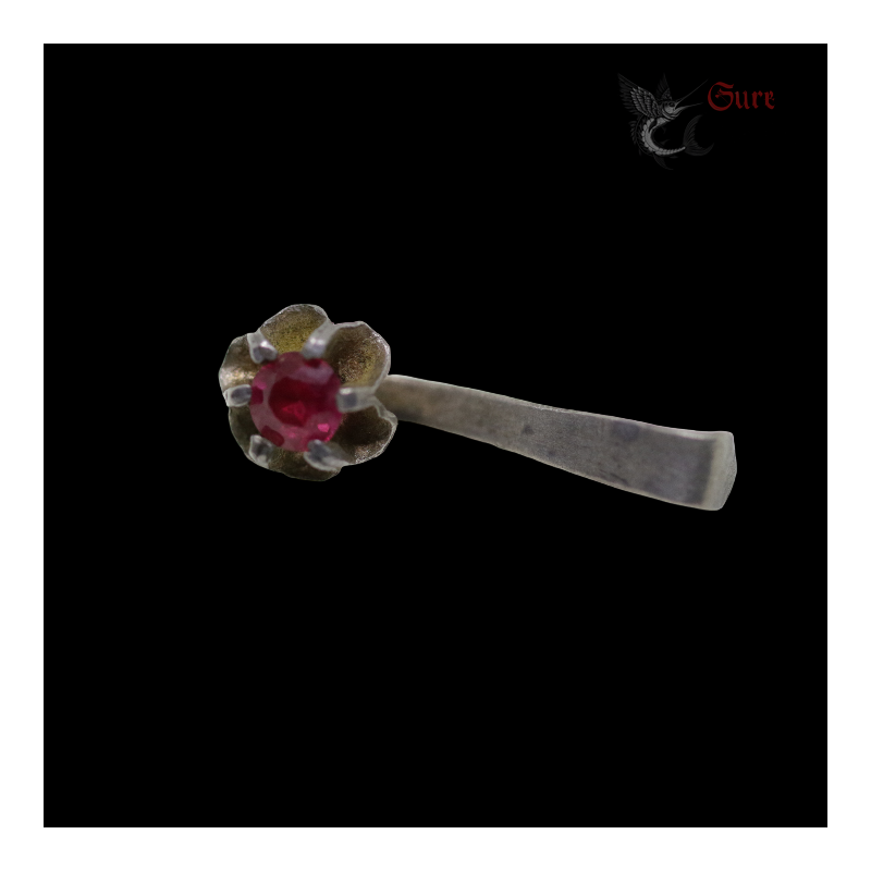 Delicately formed as an open flower, this antique earring features a vivid faceted red stone held in a traditional claw setting. The design combines subtle sophistication with excellent craftsmanship, characteristic of fine northern Vietnamese silverwork of the period. The silver has tested as a high-grade alloy, a hallmark of quality jewelry produced for affluent urban clientele.