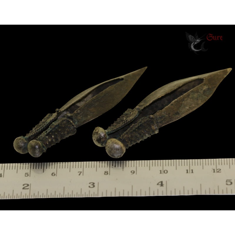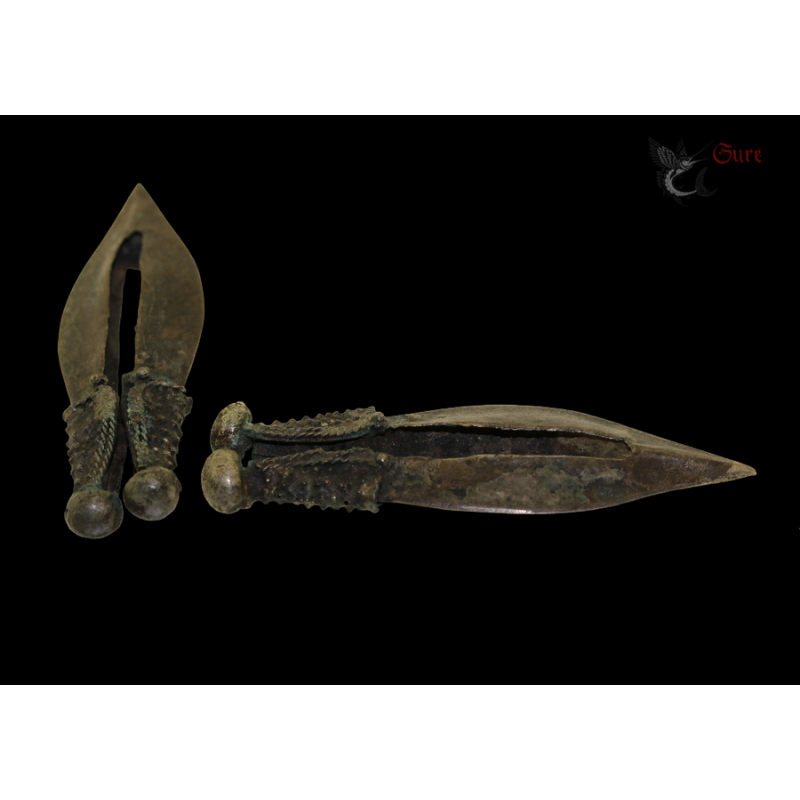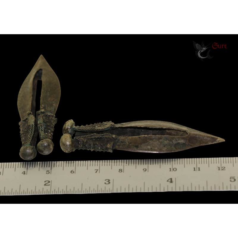 A striking pair of elongated traditional earrings from Lembata (historically “Lombien”) island, eastern Indonesia. Crafted in brass (copper–zinc alloy), these earrings reflect a refined balance of symbolism and craftsmanship, historically associated with social identity and ceremonial exchange.